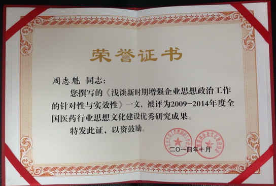 此外,總廠黨委書記周志魁同志還獲得2009-2014年“全國(guó)醫(yī)藥行業(yè)思想文化建設(shè)先進(jìn)工作者”榮譽(yù)稱號(hào),他撰寫的“淺談新時(shí)期增強(qiáng)企業(yè)思想政治工作的針對(duì)性與實(shí)效性”及政工部潘如禮同志撰寫的“以文化建設(shè)推進(jìn)企業(yè)思想政治工作開展”等2篇論文被評(píng)為2009—2014年“全國(guó)醫(yī)藥行業(yè)思想文化建設(shè)優(yōu)秀研究成果”。