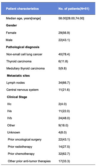 入組患者既往接受過手術、放療或化療治療,其中,78.4%(n=40)的患者為NSCLC患者,男性與女性患者比例相近,21.6%(N=11)的患者出現(xiàn)CNS轉移[1]。