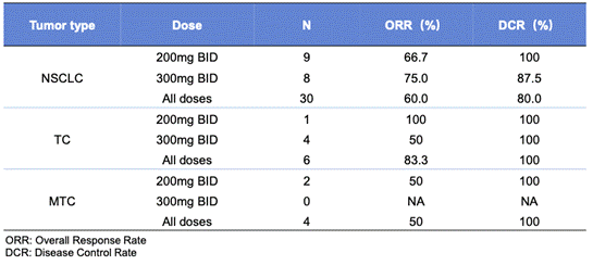 在40例可評估的患者中,獨立審查委員會根據(jù)RECIST v1.1確認的總緩解率(ORR)和疾病控制率(DCR)分別為62.5%和85%。其中,RET融合NSCLC(n=30)、TC患者(n=6)、MTC患者(n=4)的ORR/DCR分別為60%/80%、83.3%/100%和50%/100。而IRC在 200mg和 300mg(BID)的劑量組中所測定的ORR和DCR分別為 66.7%/100% 和 75%/91.7%[1]。