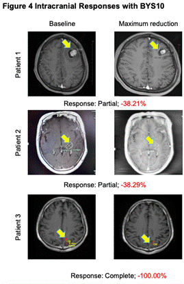 研究人員在4例至少有1個可測量顱內(nèi)病灶(1例顱內(nèi)完全緩解)的患者中觀察到顱內(nèi)抗腫瘤活性。