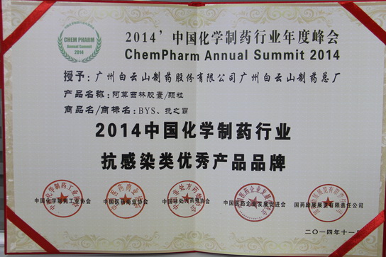 阿莫西林膠囊/顆粒獲“2014中國(guó)化學(xué)制藥行業(yè)抗感染類優(yōu)秀產(chǎn)品品牌”